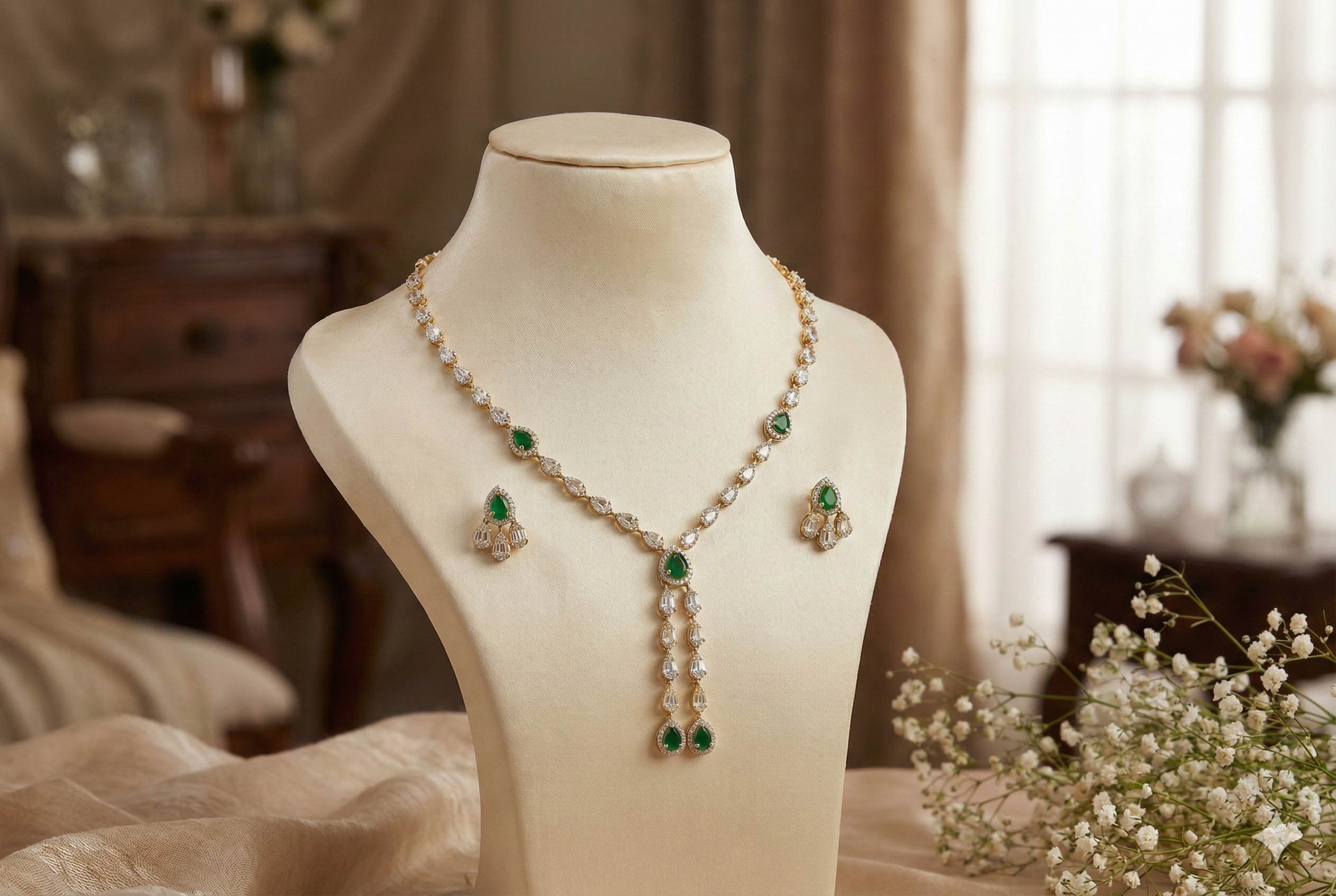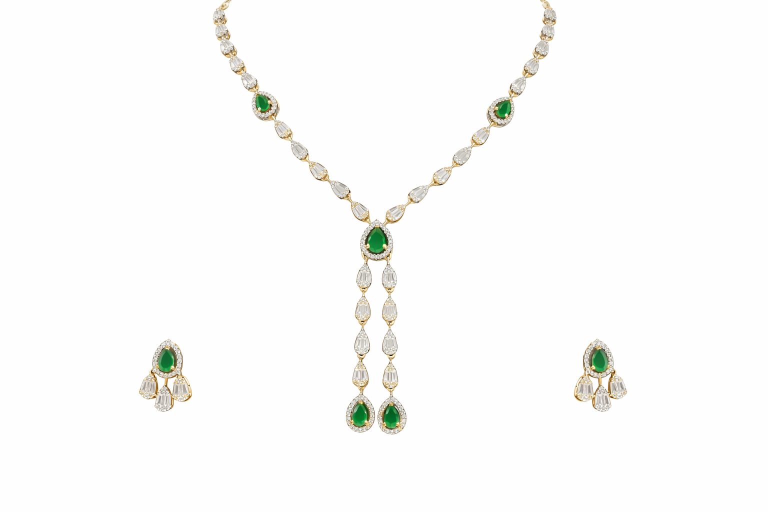Arira Stylish Gold Finish White and Green Stone American Diamond Set with Earrings