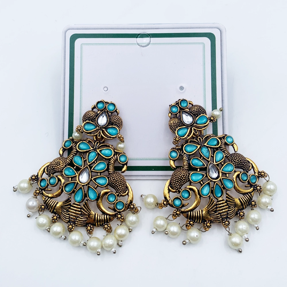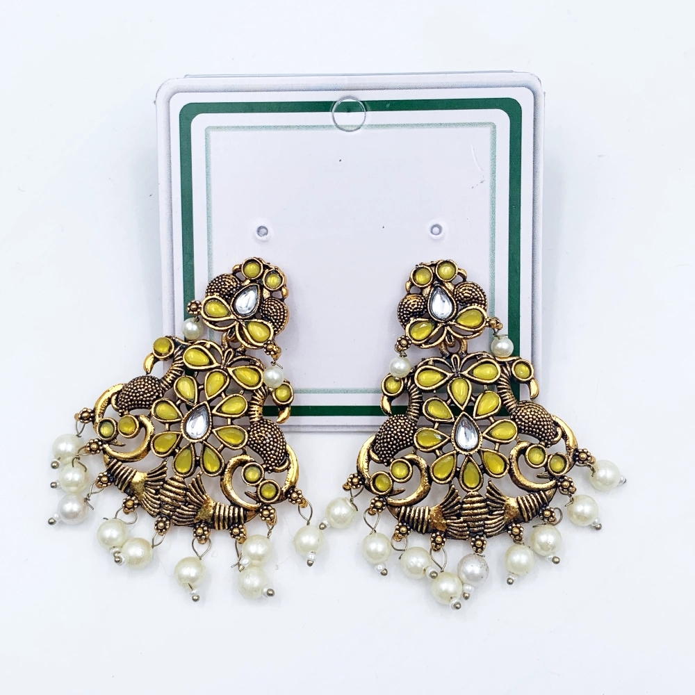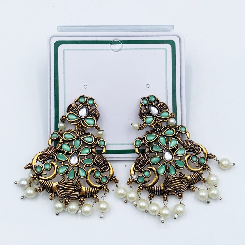 Arira Antique Gold finish green stone earings with small white pearls