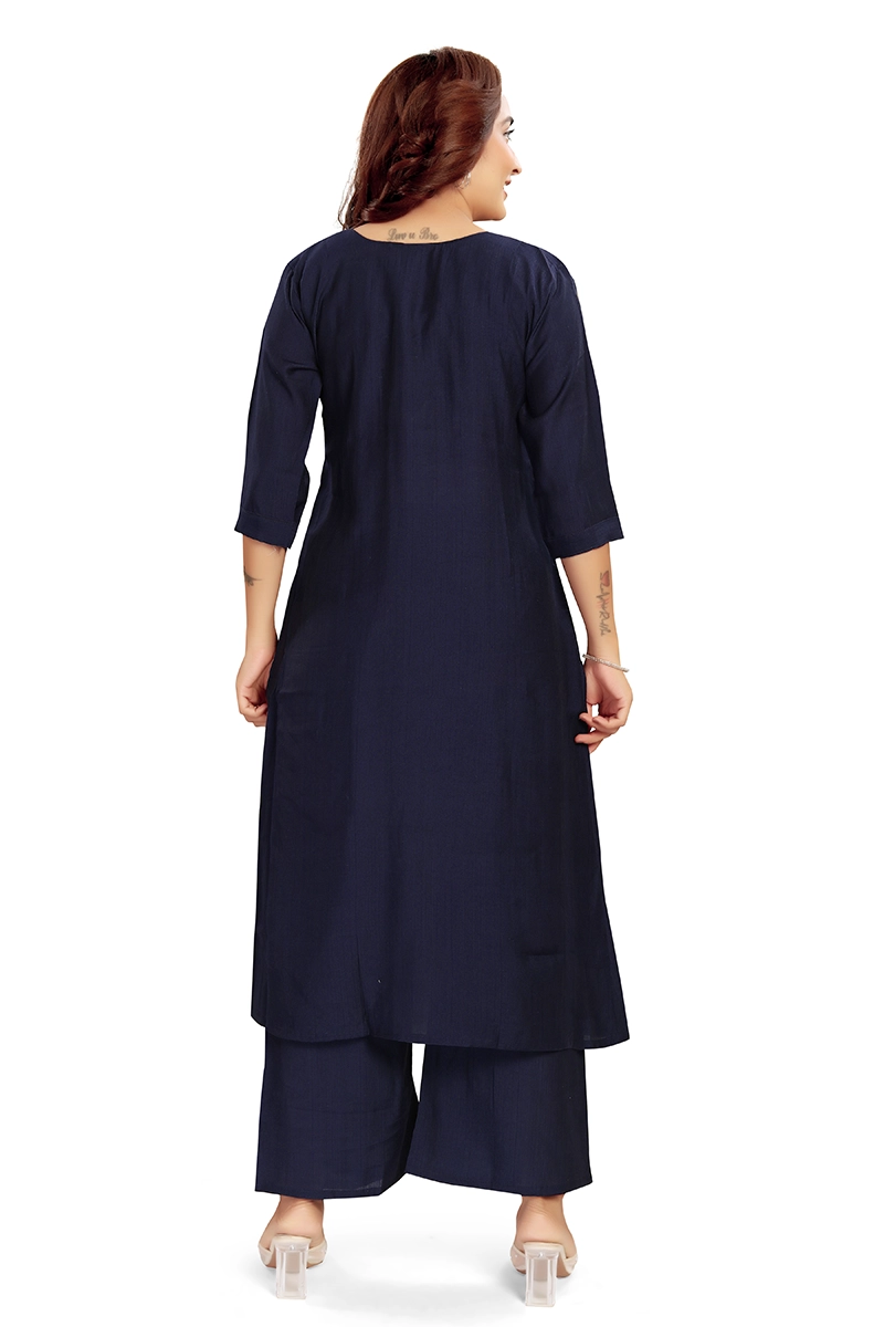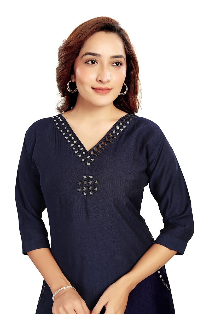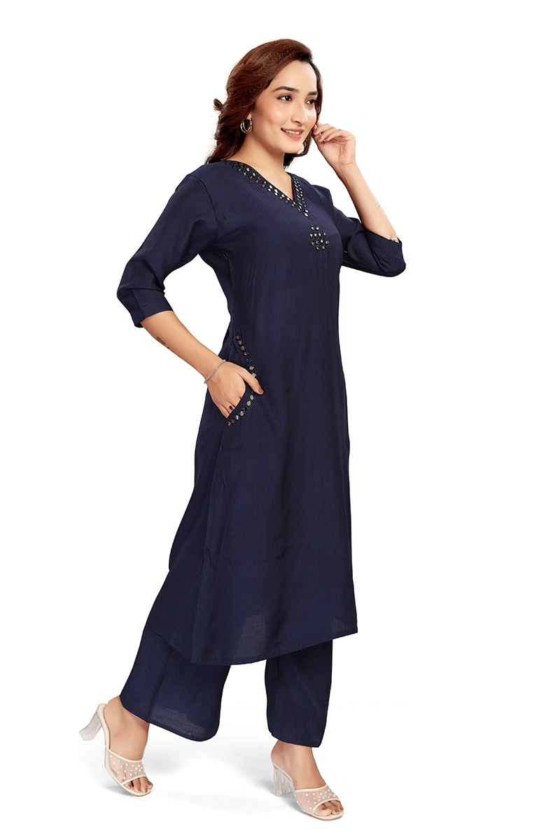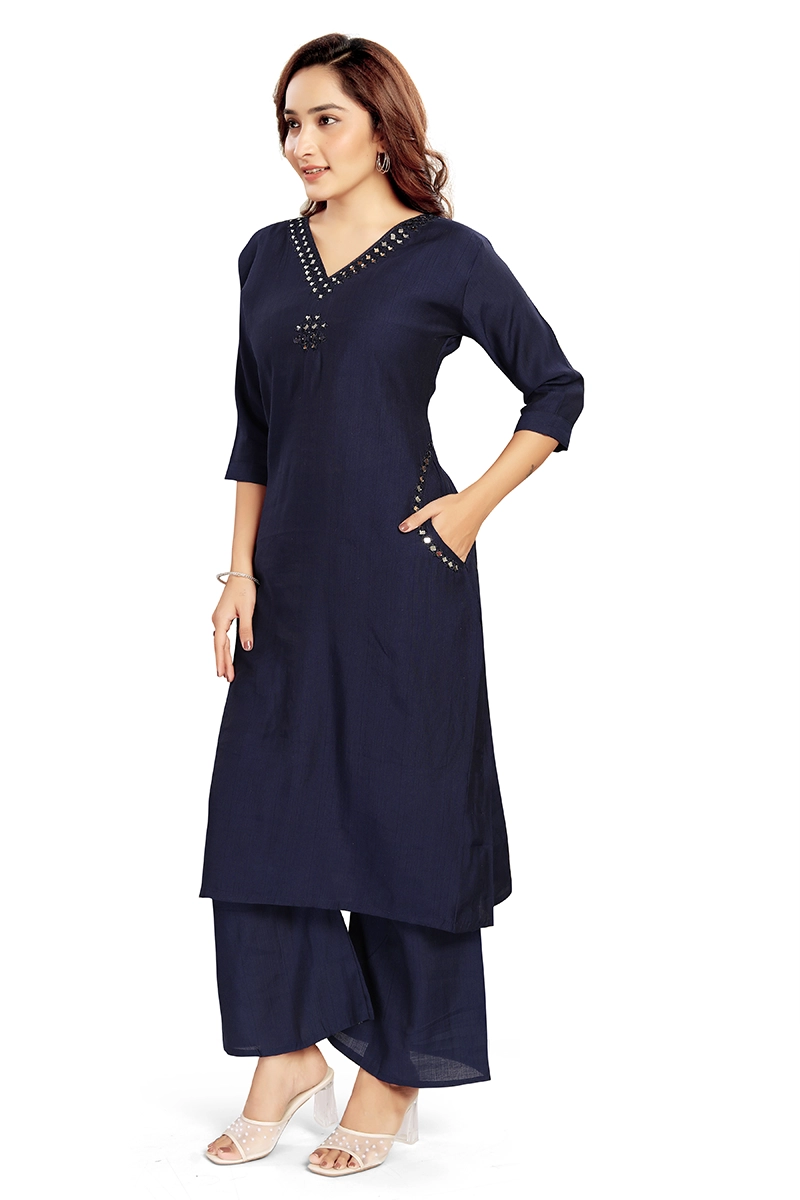 Arira designer wear silk kurta with palazzo pants with mirror work on neck and pocket