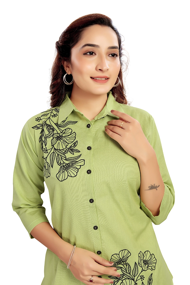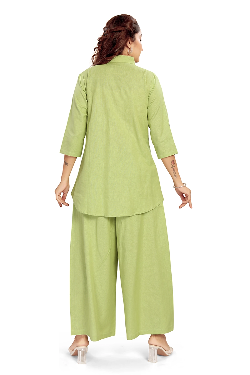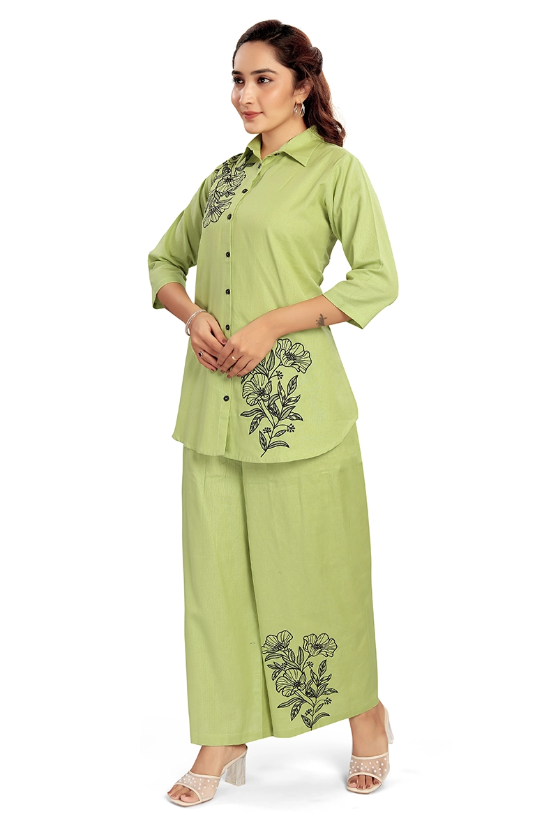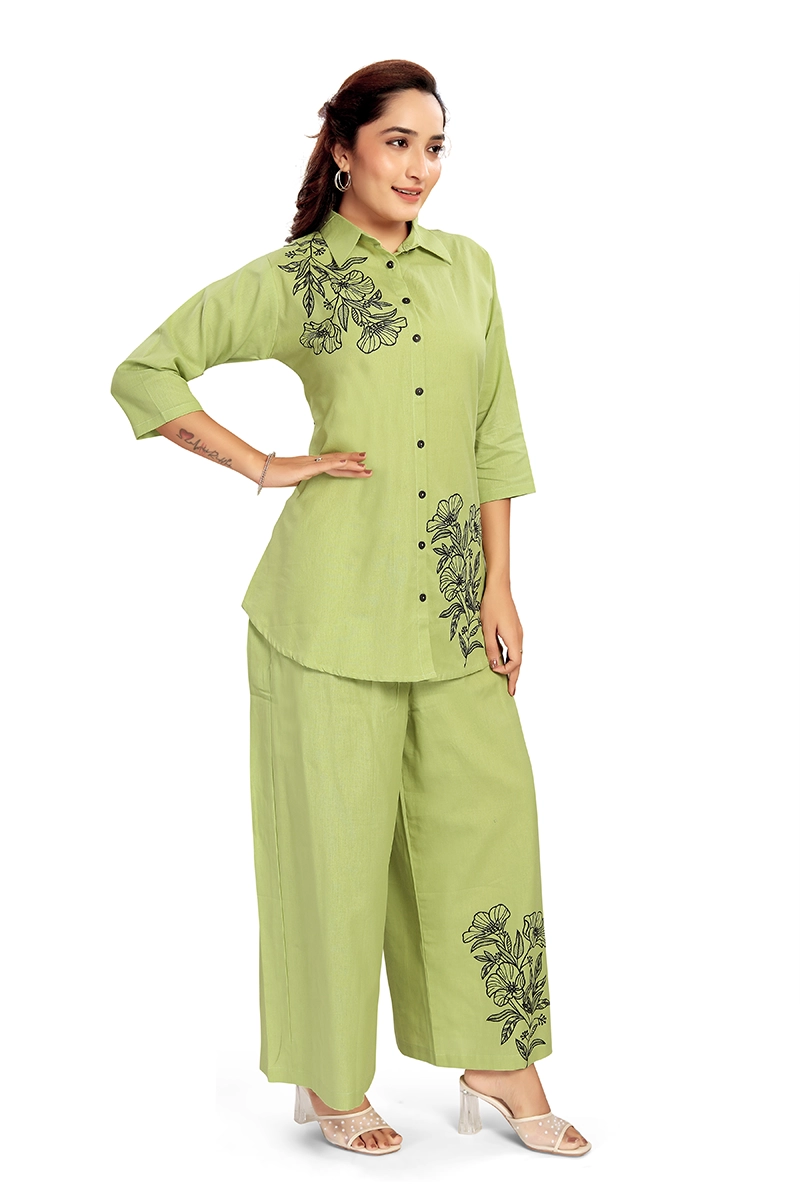 Arira Green coord set with black embroidery on top and pants in cotton linen