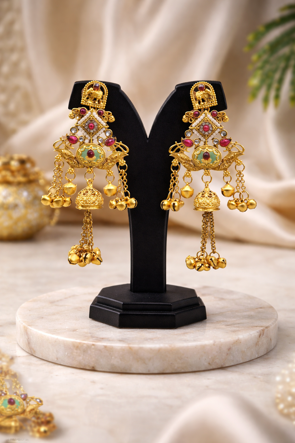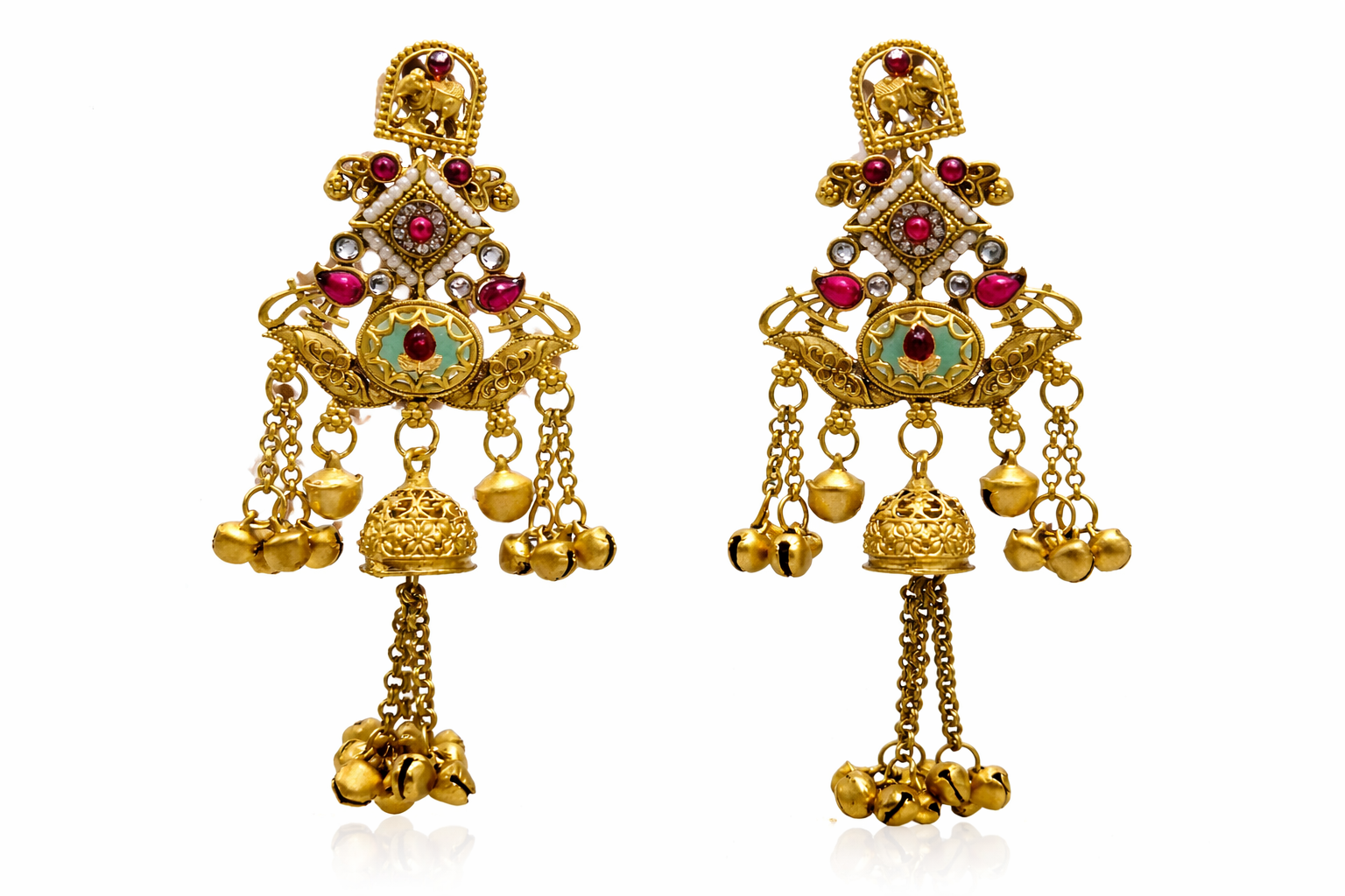 Arira Golden with White ,Peach and Green Stone Long Kashmiri Earrings with Ghungroo Latkan