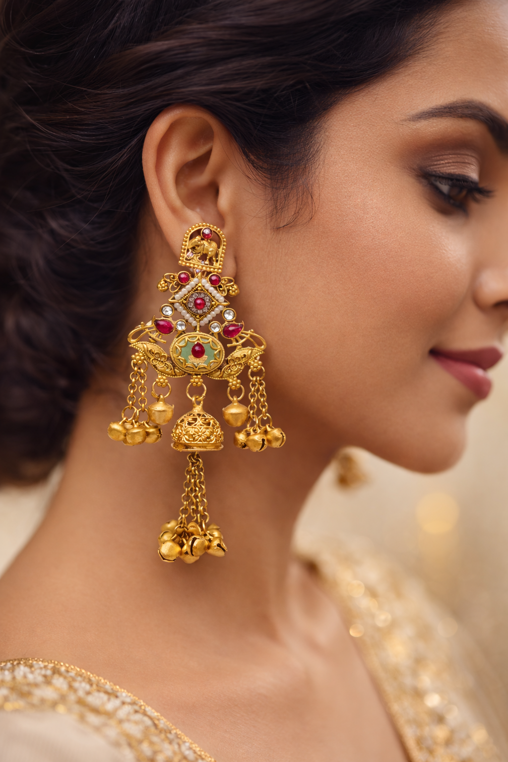 Arira Golden with Red Stone Long Kashmiri Earrings with Ghungroo Latkan