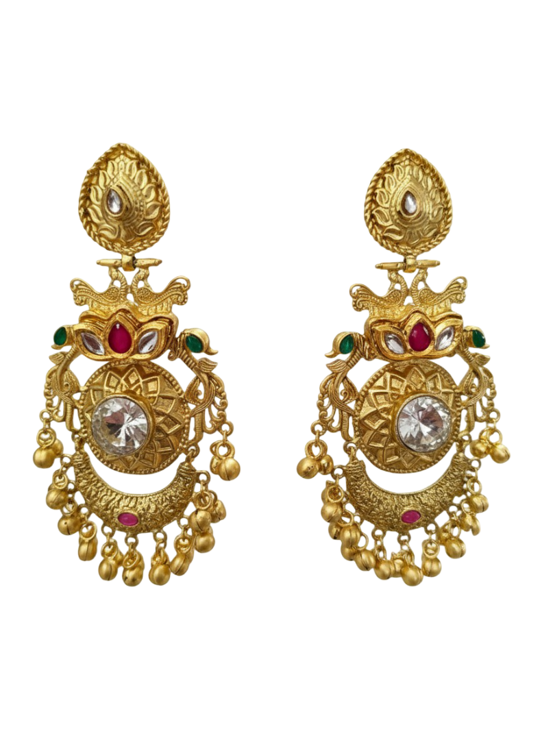 Arira Golden Long Traditional Earrings With Red Stone With Ghungroo