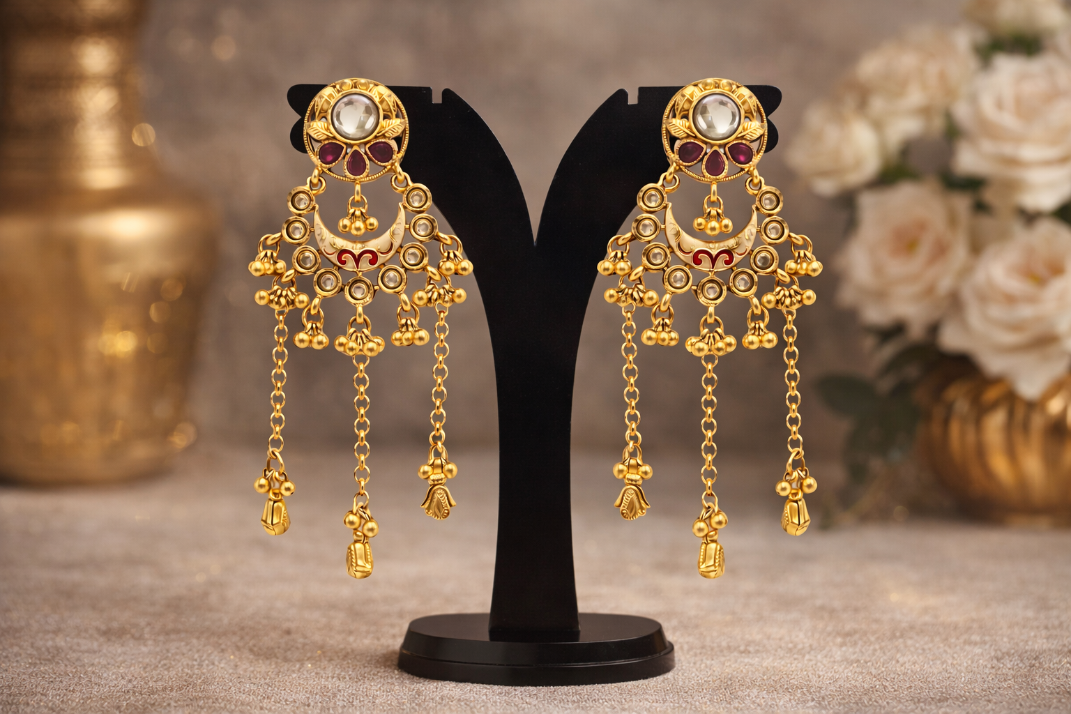 Arira Golden with Red and Green stone Long Kashmiri Earrings with Ghungroo Latkan