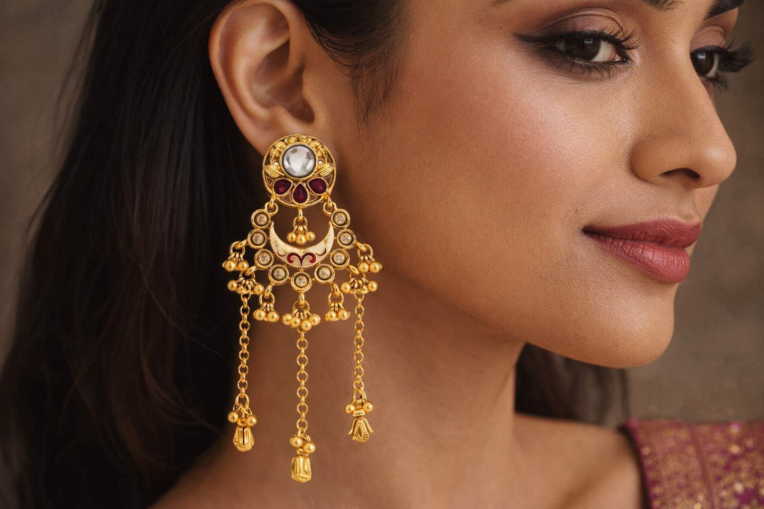 Arira Golden and Maroon long Kashmiri Earrings with Ghungroo Latkan