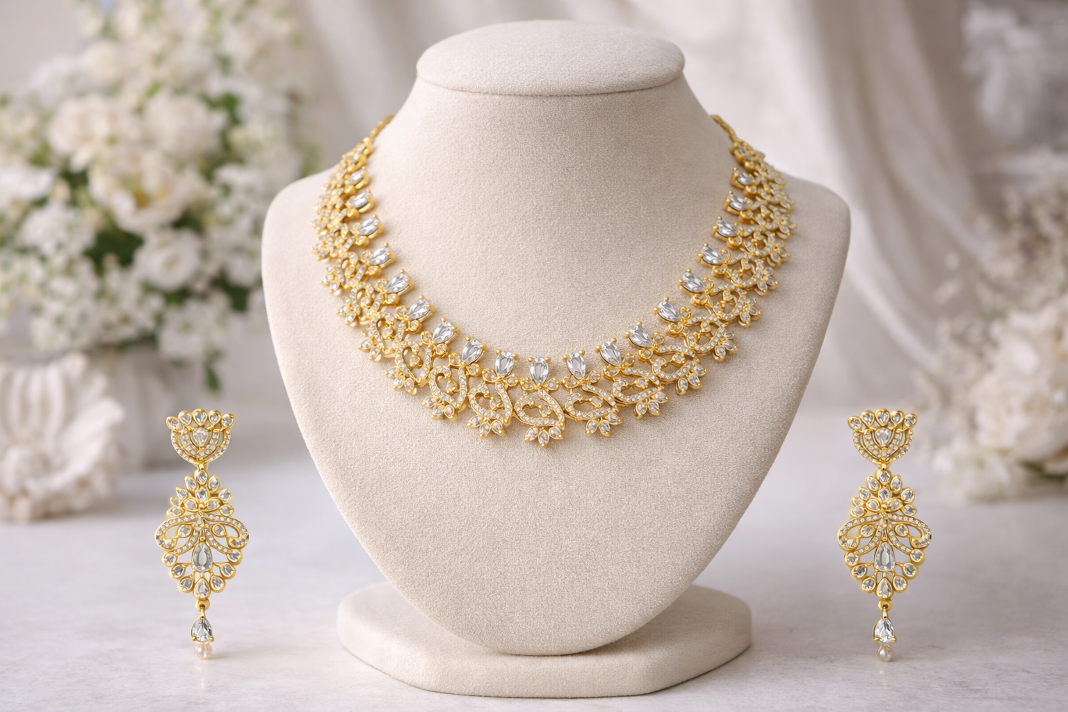 Arira Golden Finish White Stone Anti Tarnish American Diamond Elegant Necklace with Earrings