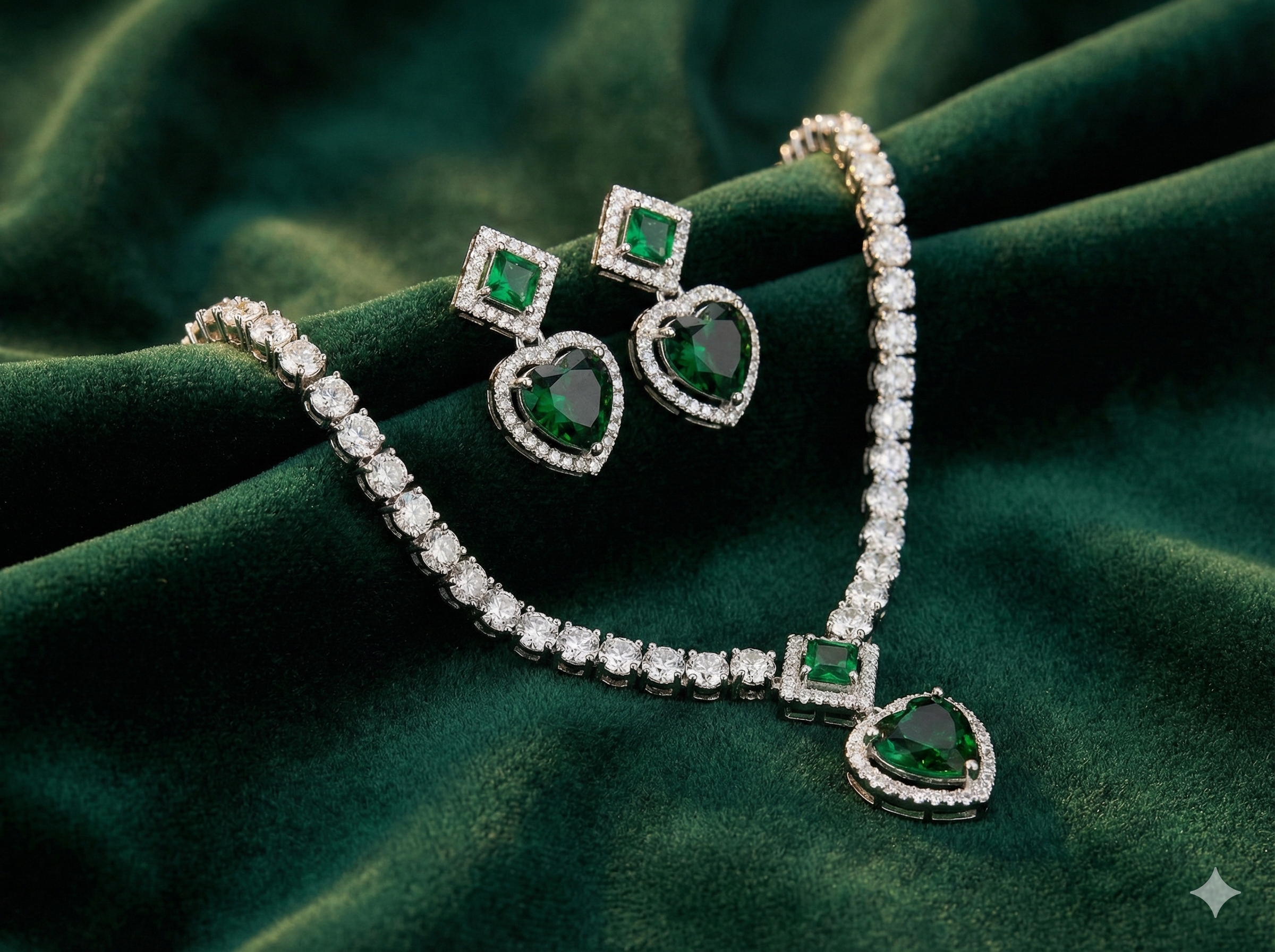 Arira Silver Finish Green Stone Pendent Style with White Stones American Diamond Set with Earrings